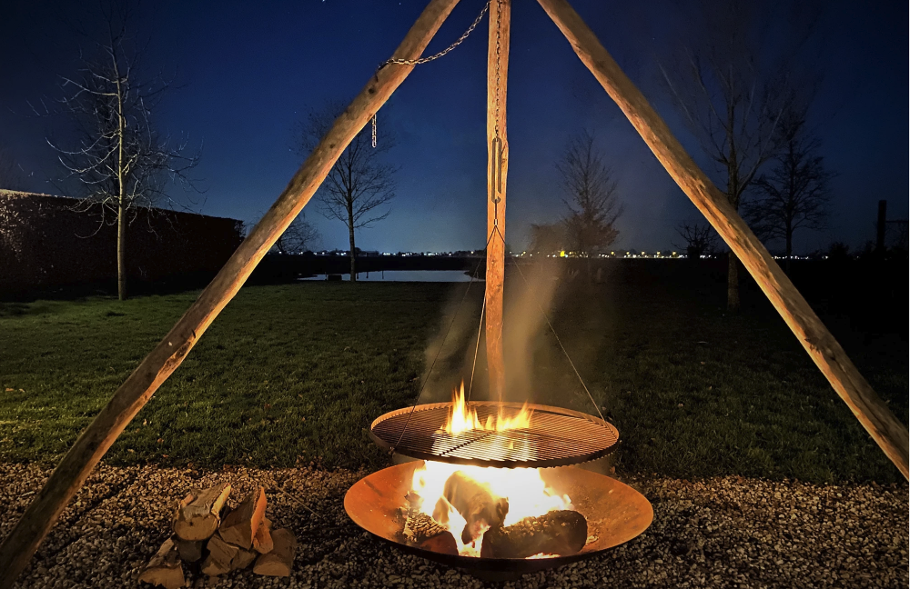 Anmerkung: Im Lieferumfang ist nur das komplette und einsatzbereite Dreibein-Holzstativ enthalten. Alle Holzstative können optionell mit einem Grillrost, Dutch Ofen und/oder einer Feuerschale erweitert werden. Hier bieten wir unseren Kunden schier unzählig viele, verschiedene Optionen an.