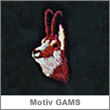 Andere Stickereien weiterer, toller Tiermotive finden Sie ebenfalls hier im Shop: Es sind die Motive Riserva-Logo (R1443), Bär (R1434), Sau (R1400), Gams (R1405), Rehbock (R1401), Elch (R1433), Hirsch (R1404), Fuchs (R1441), Mufflon (R1439) & Damhirsch (R1440) möglich.