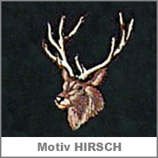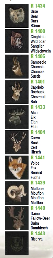 Andere Stickereien weiterer, toller Tiermotive finden Sie ebenfalls hier im Shop: Es sind die Motive Riserva-Logo (R1443), Bär (R1434), Sau (R1400), Gams (R1405), Rehbock (R1401), Elch (R1433), Hirsch (R1404), Fuchs (R1441), Mufflon (R1439) & Damhirsch (R1440) möglich.