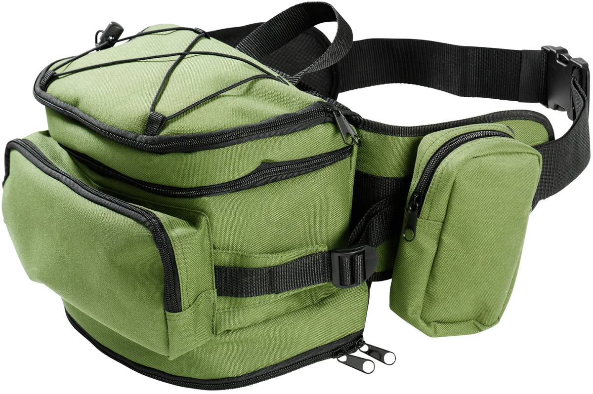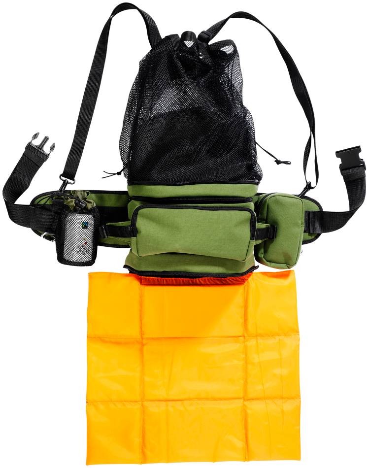 Sehr praktische und funktionelle Hüfttasche für alle Arten Outdoor-Aktivitäten, Wandern oder auf Reisen. Die Tasche ist aus starkem, glattem und wasserabweisendem 1000 D Nylon gefertigt. Der breite und bequeme Hüftgurt ist stufenlos verstellbar und wird mit einem stabilen Schnellverschluss verschlossen. Links neber der Rückentasche befindet sich eine Netztasche für eine Wasserflasche und rechts von der Haupttasche eine kleinere RV-Tasche für Utensilien wie zum Beispiel ein Handy oder eine Kompakt-Kamera. Die Haupttasche selber hat im Deckel ein Fach in dem eine Netz-Tasche aus Mesh mit Kordelstopper versteckt ist. Durch zwei verstellbare Träger, die am Gürtel befestigt werden können, kann die Netztasche dann auch schnell und einfach als Rucksack umfunktioniert werden. Das große Hauptfach hat noch eine kleinere, aufgesetzte Außentasche. Im Boden des Hauptfachs ist ein wärmeisolierendes und wasserabweisendes Sitzkissen in Signal-Orangener Farbe (Maße: 50,5 x 45 cm) untergebracht. Das Sitzpolster ist mit einem Klettverschluss an der Tasche befestigt, kann leicht entfernt und in einer Notfallsituation auch zur Signalisierung verwendet werden.
