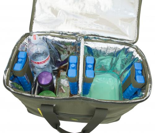 Neben den 4 großen Kühl-Akkus, die mit Klettverschlus an den Innenseiten der Hühltasche befestigt werden können, verfügt die Kühltasche über eine flexibele, herausnehmbare Trennwand. Somit kann die Kühltasche je nach Bedarf entweder in eine grosse oder aber in zwei kleinere Kompartimente aufgeteilt werden. Der stabile Reissverschluss des Deckels kann jeweils von zwei Seiten geöffnet werden, wodurch auch jedes Kompartiment für sich, einzeln zur Mitte hin geöffnet werden kann.