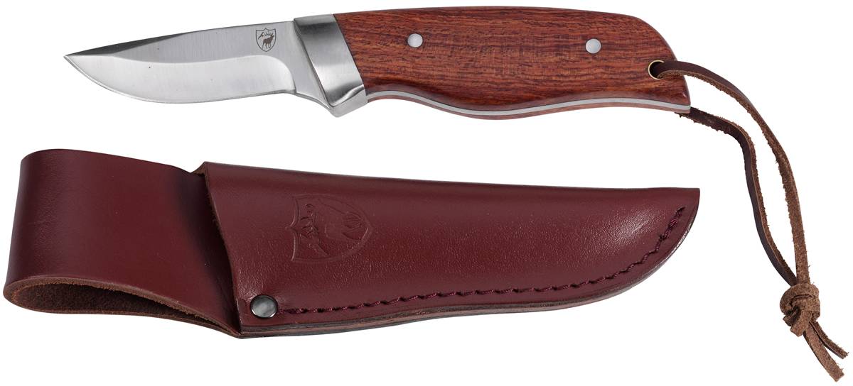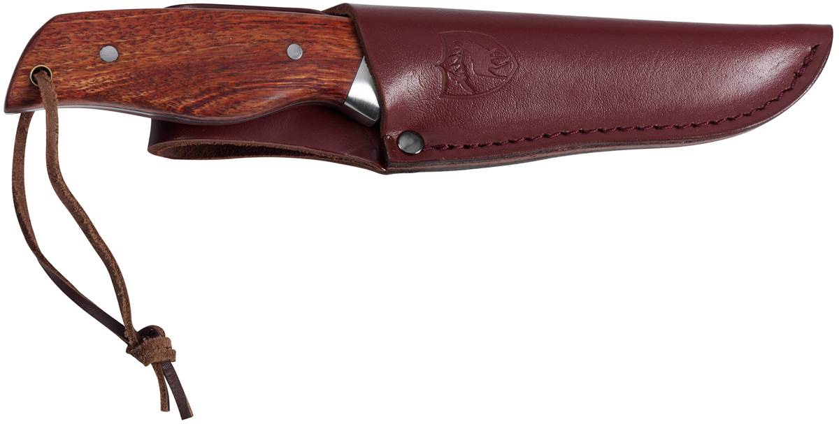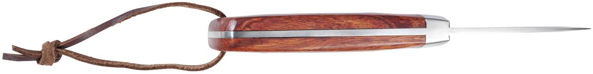 Das 'Nordic Hunting Knive' ist aus einem einzigen, massiven Stück Stahl gefertigt. Das heißt: die Klinge zieht sich in seiner Verlängerung durch den gesamten Griff hindurch und die Holzbacken des Griffstücks sind direkt an dem Messerstahl befestigt. Großer Vorteil davon ist, dass die Klinge keine Schwachstellen wie Schweißstellen oder Schweissnähte aufweist und das Gewicht perfekt ausgewogen ist. Der ergonomisch geformte Griff ist aus hochwertigem, geöltem Hartholz gearbeitet. So liegt das Messer gut, griffig und stabil in der Hand, auch in feuchter Umgebung. Am Griffende ist eine Sicherheitsschlinge aus echtem Leder befestigt.