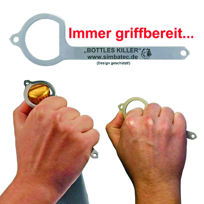 Es kann einerseits als ultra kleiner und leichter Flaschenöffner verwendet werden oder aber -wenn man den Zeigefinger oben durch die Kronkorkenöffnung steckt und das Tool so mit der Hand umschliesst- als Stossobjekt um zB Glas zu zerschlagen o.ä.
